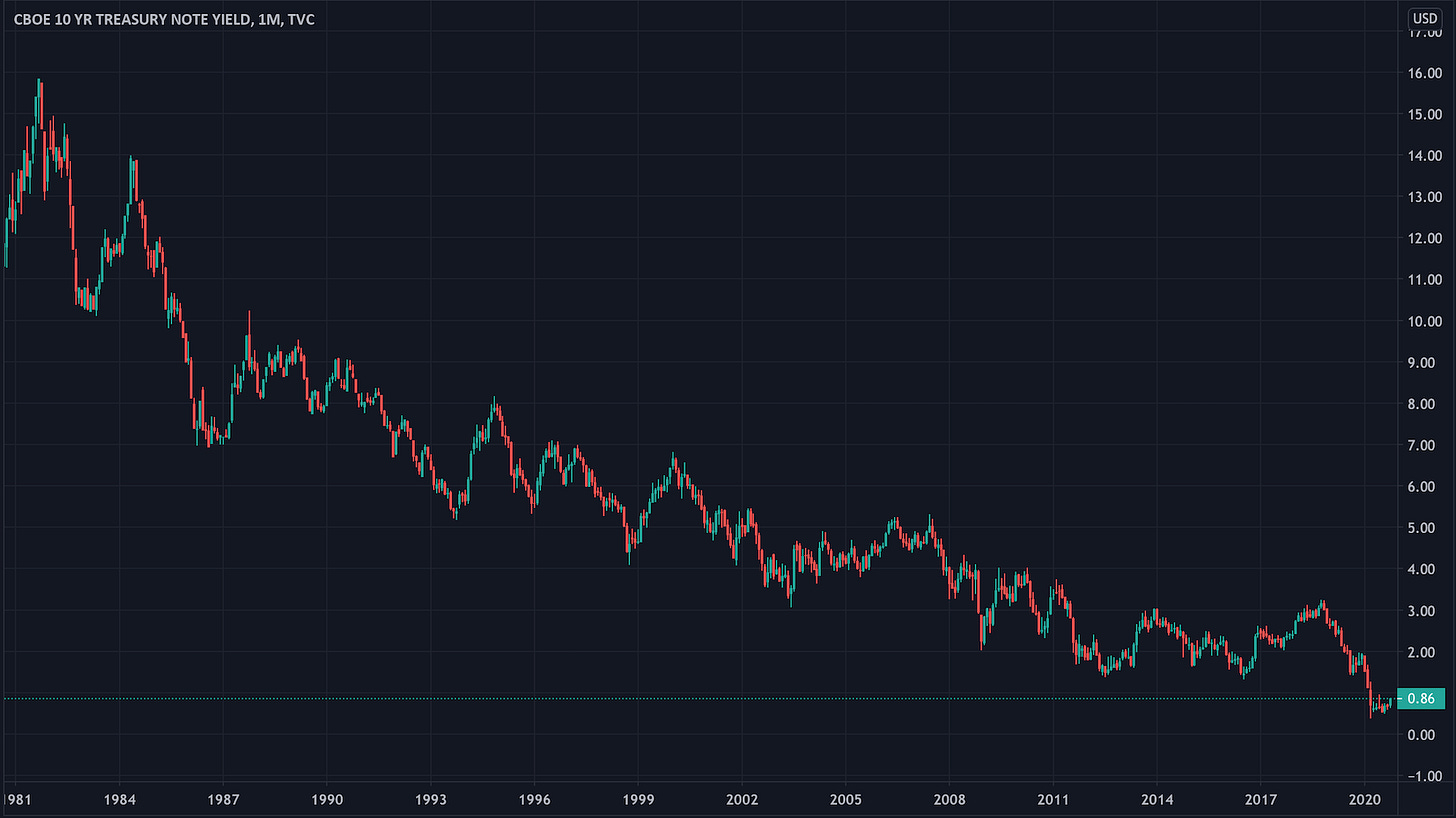 I'm writing this to everyone because I'm very worried that we are at a market top with respect to bonds. Bonds will never again be as expensive again as they are today. As you may or may not know, bond prices rise as interest rates fall. And bond prices fall when interest rates rise. It is an inverse relationship. I've attached a chart showing the 10-year treasury yield (the interest rate) over my lifetime. As you can see it has steadily fallen to zero. It literally cannot fall any further unless rates go negative. That means you'd have to pay the government to have them hold your money. Unless you think that's a realistic scenario for the United States you shouldn't own any bonds right now. I'm sure some of you are very heavily invested in bonds, because the typical advice is to buy bonds when nearing retirement. That has always been good advice because bonds are usually less volatile than stocks and pay a steady interest. But now things have fundamentally changed.
