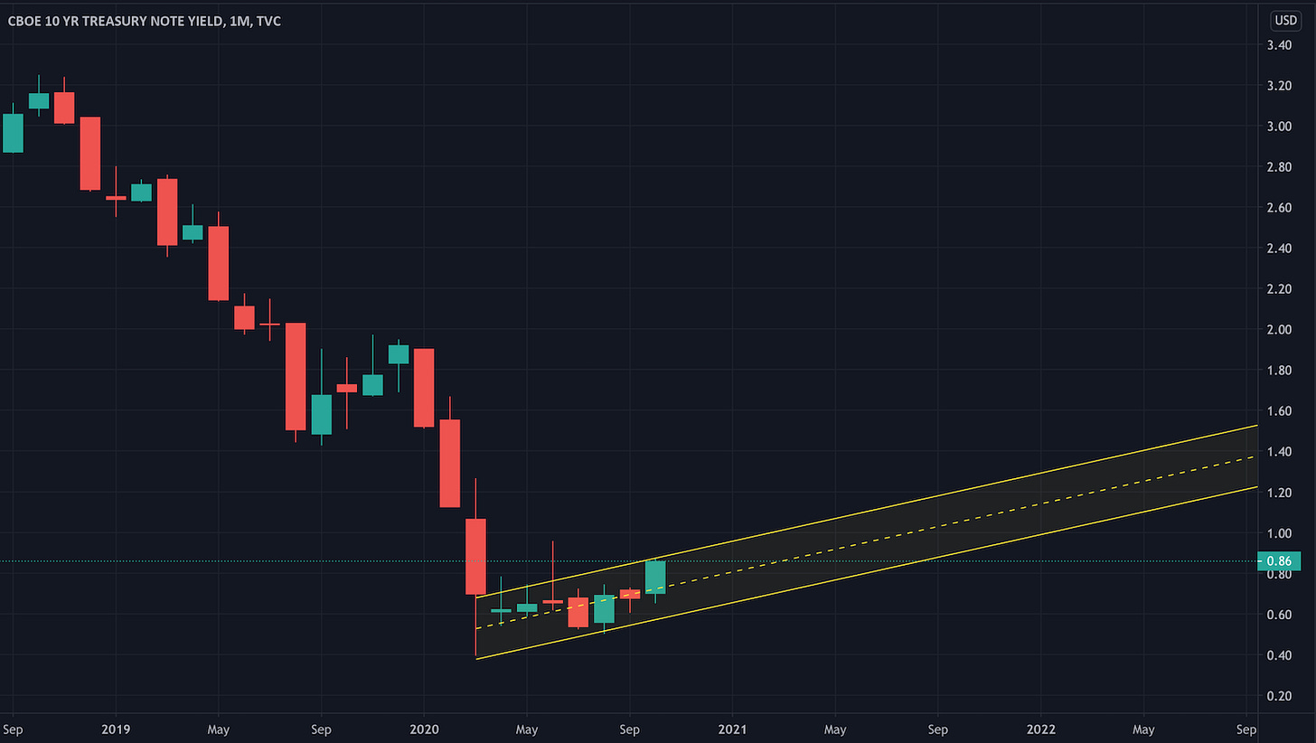 This constant downward fall in interest rates over the past decades is what has allowed bond funds to perform well over the years. But that is going to be impossible going forward, because the interest rate cannot fall any further. And beginning in mid-August, the treasury yield bottomed out and is now rising again. If you have any mutual fund which purchases long-term bonds (20/30 years) of any kind (treasuries, emerging markets, corporate bonds), that's the worst case scenario. Those funds will lose around 15-20% of their value for every 1% increase in interest rates. A 2-3% increase in the interest rate will cut their value in half. Rates have already gone from 0.60% to 0.87% just in the month of October. That's a 27% increase in the interest rate in just 1 month. I've attached a chart where you can see that the interest rate has begun its move upward after bottoming out after the pandemic hit in Feb/Mar.